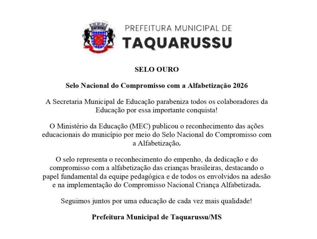 Taquarussu voltou a se destacar no senário educacional conquistando pela segunda vez consecutiva o Selo Ouro no Compromisso Nacional com a Alfabetização, reconhecimento concedido pelo Ministério da Educação (MEC) às redes de ensino que apresentam avanços significativos na alfabetização das crianças. O resultado, referente à edição 2025, destaca o compromisso do município com a alfabetização na idade certa, em alinhamento ao Plano Nacional de Educação (PNE) e ao Compromisso Nacional Criança Alfabetizada.